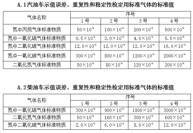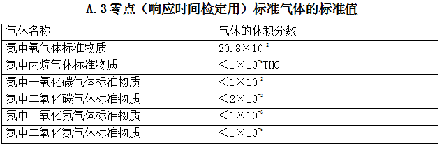 4.示值误差、重复性和稳定性坚定用标准气体的标准值见表A.1,按照测试仪标注的测试气体种类配制成单组分标准气体或多组分标准气体,但不允许气体之间发生反应。