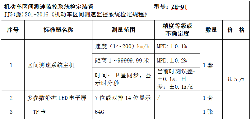 ZH-QJ型区间测速系统检定装置以GPS+北斗双模现场测速为测速、测距单元的智能化测试仪器,用以测试汽车的瞬时运动速度以及行驶距离,配合外部高亮度LED电子屏,可以对区间测速监测系统等多种测速装置进行现场测试标定。符合《道路交通区间测速监测系统》的检定要求。
